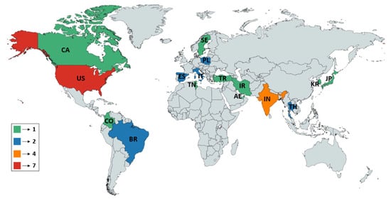 After resulting in the relevant articles for the present survey, a bibliometric analysis was first carried out in an effort to identify the geographical distribution of the research organizations dealing with the present subject. To this end, the country of origin of the organization, which is mentioned in the affiliation of the author, was taken into account as a representative sample. For two or more authors, each country contributed only once. Figure 2 depicts the aforementioned geographical distribution of the contributing research organizations, whereas the official 2-letter codes were used.