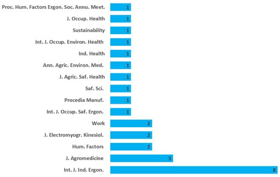 The second analysis demonstrates the relevant international journals, which included the selected articles, required to identify the research areas engaging with ergonomics in agriculture. As can be gleaned from Figure 3, the “International Journal of Industrial Ergonomics” is the main source of the present bibliographic survey with eight papers. Apart from the above journal, which pertains to occupational ergonomics from various industries, “Journal of Agromedicine”, which is obviously an agriculture-oriented journal, contributed three articles. Two journals, from which, one focusing on ergonomics and one dealing with other occupational issues, come next with two papers along with one regarding human movement coming from muscle contraction. Finally, ten journals follow with one article found on their website about occupational safety and health, ergonomics, manufacturing, sustainability, and interdisciplinary fields combing agriculture with medicine and safety. As can be easily inferred, the subject of the present literature review is a versatile issue concerning multiple scientific fields, not only the agricultural one. This is reasonable, as agriculture occupies the majority of workers worldwide. As a consequence, determining of the optimal body postures, risk factors, and interventions as a means to lessen the pathogenesis of MSDs is an urgent duty. In Figure 3, the abbreviation of each journal was used for the sake of brevity.