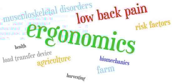 As it was expected, “ergonomics” was the most common keyword. The keyword “low back pain” followed, showing the body part that is most affected from agricultural activities, which is in line with the relative literature [8]. The keywords “musculoskeletal disorders” and “farm” came next, as they are strongly associated with the subject of the present investigation. The keywords “agriculture” (demonstrating the field of interest) along with “risk factors” (indicating that the studies focused on identifying the causes for MSDs) followed with the same frequency. Moreover, “biomechanics”, which pertains to kinesiology and the mechanics of movement, came next. The keyword “load transfer device” that follows corresponds to a personal device, which has been introduced in agriculture, as an ergonomic intervention to lessen the load in the region of the lumbar spine [35]. Finally, the keywords “harvesting” and “health” presented with equal incidence. The former constituted the majority of the investigated manual operations of the selected papers, whereas the latter indicated the adverse consequences of rural occupation and the need for implementing ergonomic interventions for the safety of workers.