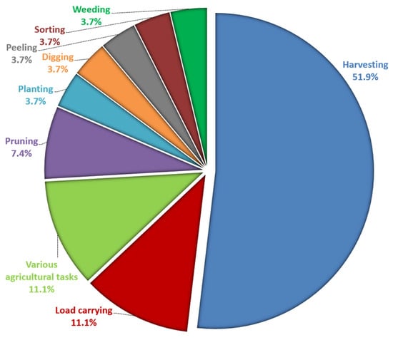 Obviously, according to Table 1, out of the 27 accepted journal papers, the most highly examined manual operation during the last decade was the activity of harvesting (51.9%). The second considered tasks were the load carrying (11.1%) as well as the examination of multiple tasks taking place in agriculture (11.1%). Pruning followed (7.4%), with planting, digging, peeling (of pineapples), sorting, and weeding coming next (3.7%), with one study presented for each of them. The content as well as the dangers, in terms of exposure to MSDs, involved in each task was described in the corresponding subsections in 3.2. Concerning the crops that were involved in the accepted papers, there was a variety of crops ranging from apples, oranges, and grapes, to low-growing crops such as vegetables, rice, melons, and strawberries. This observation demonstrates that all types of cultivations can cause MSDs to workers. Remarkably, low-growing crops constituted the majority of the studies presented in Table 1. These low heights of growing crops force the workers to stoop and kneel, in an iterative manner, with the intention of reaching them, thus, contributing in the onset of low back disorders and knee OA. The distribution of the agricultural manual operations according to the 27 selected investigations can be depicted in the pie chart of Figure 5.