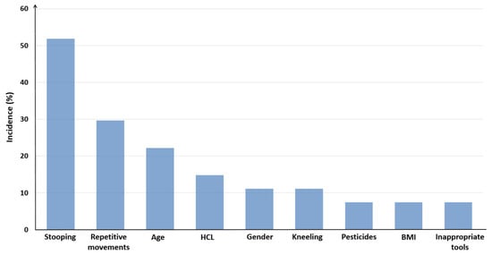 The risk factors for the development of MSDs, which are illustrated in Figure 6 in the form of a bar chart, were noted to be highly related to stooping, namely, the prolonged trunk flexion. This posture is inherent in a lot of rural activities that should be performed near the ground level. In particular, the identification of stooping as a risk factor was found in the majority of the selected papers (51.9%). Taking into account the adverse consequences of this body posture on the low back, it can be explained why low back injuries are of epidemic proportion among agricultural workers worldwide [8,9,59]. More specifically, stooping is commonly used for high-energy tasks, as the tissues of the back support the upper torso and, thus, lower the needs in postural energy and provide more energy for the agricultural operation [8]. Nonetheless, stooping together with the intensive heavy work escalates the low back pain to a great extent.