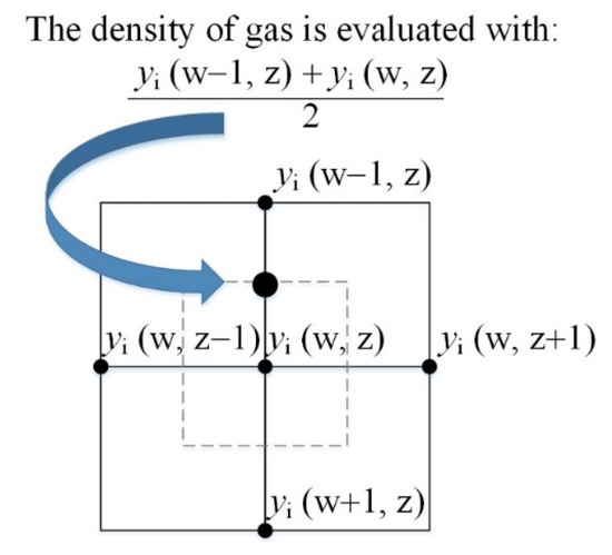 It should be noted that discretization of the divergence terms in Equations (3) and (10) should be done carefully, since ρair/fuel changes within pores, and thus across each discretization step. If the central differencing scheme is used, ρair/fuel should be evaluated in the middle of the two adjacent discretization points. A good approximation is obtained if the average mass fraction is used in Equations (11) and (12). Figure 1 shows the aforementioned situation schematically.