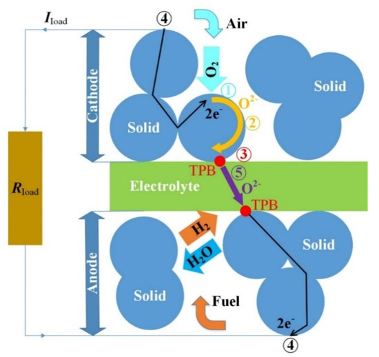 It is assumed the oxygen (O2) that fills the pores of solid (i.e., mixed ionic-electronic conductive—MIEC)) material is adsorbed into the cathode surface. Oxygen ions (O2−) are formed with a double negative charge by accepting electrons (e−) from the cathode. The flow of O2− (JO2−) can be modeled as follows [16]: