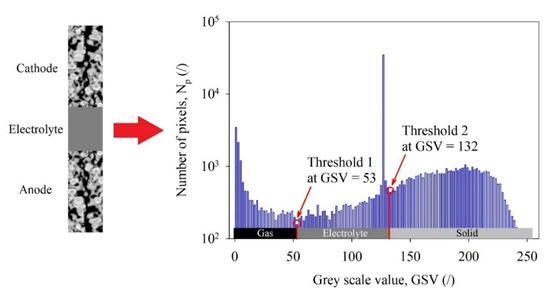 An image of a SOFC cross-section profile was used to define the geometry of modeled domains (cathode, electrolyte, and anode) within the SOFC. The image had to be processed properly to detect the three different phases (solid, electrolyte, and gas) present within the real SOFC. Different image processing algorithms can be found in the literature [18,19,20]. Many ideas of how to choose a global threshold have been already presented [19]. Most of these methods derive the threshold value using the properties of an image histogram. A similar problem of how to detect different phases from threshold values has been already addressed in Ref. [20]. It is assumed that the grey values of the phases are normally distributed and sufficiently apart from each other. Hence their superposition results in a local minimum between the two phases when inspected in the pixel histogram [20].