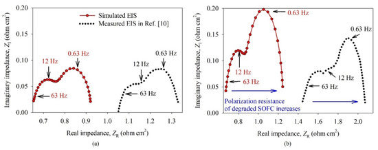 The modeled cell was perturbed at OCV, according to the measurement results in Ref. [10], with sinusoidal voltage with the amplitude 14 mV. The frequency (f) of voltage signal was set to each of 31 logarithmically equally spaced values of frequency from 0.1 Hz to 100 Hz to simulate the EIS. The temperature was set to 900 °C. Other input parameters of the model can be found in Table 2. Figure 6 shows EIS of (a) non-degraded (i.e., at time t = 0 h) and (b) degraded SOFC (i.e., at time t = 1000 h). The low-range frequency arc was attributed to the anode charge transfer, whereas the mid-range frequency arc was correlated with charge transfer and surface exchange process in the cathode.