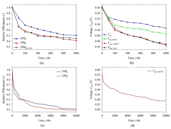 Figure 7a shows relative TPB density in the anode (TPBa) and in the cathode (TPBc) as a function of time. The calculated relative TPBa density had a similar profile as that in Figure 8d in Ref. [10]. The initial absolute value of TPBa (t = 0 h) was approximately four times lower (0.7 μm−2 vs. 2.9 μm−2), but another study revealed [30] that the density of active TPBs may be lower (0.74 μm−2). Since the TPBs that lie in the third dimension (i.e., in the plane of 2-D grey-scale image) cannot be resolved with our algorithm, it was obvious why the obtained density of TPBs from 2-D grey-scale image was lower. Although the TPB density was lower in our case than it should have been (or than it was in the real SOFC), it could be compensated for with higher activity of TPBs (i.e., higher exchange current density, i0,a/c) to achieve a similar electric performance of modeled SOFC. It is important to note the presented model approximated the spatial distribution of TPBs in real SOFC. Due to this, it could be expected that the simulation results may be more reliable compared to those obtained with 0-D or 1-D models.