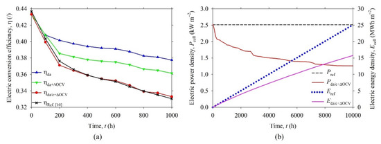 The Pel is electric power density, Pin is input power density, Φin,H2 is input molar flux of hydrogen. It can be noticed that η depends on the output voltage of SOFC (Vcell), Faraday constant (F), and standard enthalpy of formation for hydrogen (ΔHH2) only if it is assumed that each oxidized H2 contributes two electrons, Equation (2). Figure 8a shows the η of the SOFC as a function of time. The reference conversion efficiency (ηRef. [10]) dropped rapidly from 0 to 200 h and moderately from 200 h to 1000 h (by approximately 0.07 and 0.04, respectively). A similar trend of the conversion efficiency (ηda/c+ΔOCV) of SOFC, with degraded anode/cathode and ΔOCV, was observed. The absolute degradation rate of ηRef. [10] from 0 to 1000 h was estimated to be 0.11 kh−1, whereas the relative degradation rate was about 25% kh−1. Similar degradation rates of ηda/c+ΔOCV were noticed. These values were high, but it should be noted that the real SOFC degradation test was performed at high temperature (900 °C). The details about the experimental test can be found in Ref. [10].