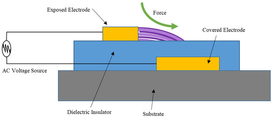 A plasma can be defined as follows: “A plasma is a quasi-neutral gas of charged and neutral particles which exhibits collective behavior” [7]. There are several common types of plasma actuators used for aerodynamic flow control: glow discharges, DBDs, and magnetically-accelerated surface discharges are some of the most popular. DBDs are one of the commonly used actuators for active flow control of low speed applications. Werner first introduced this plasma actuator in 1857 for ozone generation [8,9]. A schematic of a typical DBD plasma actuator is shown in Figure 1.