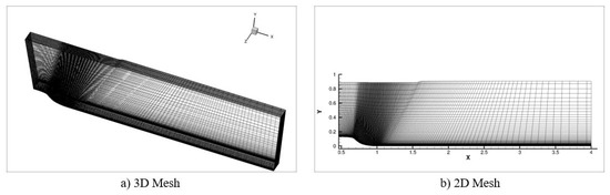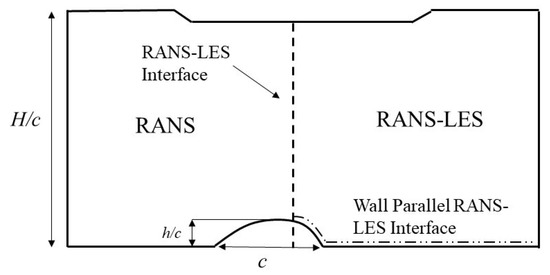 Figure 4 shows the entire domain geometry; however, the modified version of the grid was used to reduce the computational domain, shown in Figure 5. The grid used for this work was the mandatory grid used for hump model computations and was provided by the Advanced Turbulence Simulation for Aerodynamic Application Challenges (ATAAC) project. The grid was fine in area close to the point of incipient separations. The mesh used for our cases had cells with . The details of the full geometry and initial flow conditions can be found on the NASA CFDVAL2004 and ATAAC project homepage [47]. The maximum heights of the hump and the channel were and , respectively.