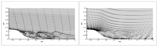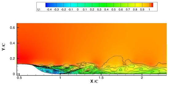 Figure 6 shown above highlights the turbulent boundary layer flow separation in terms of velocity streamlines and vectors. Figure 6a,b represents the velocity streamlines and vectors, respectively. The streamline figure helps to observe visually the location of the unsteady flow separation on the leeside of the hump due to the adverse pressure gradient. It was observed from the result that the flow separation region was roughly between the non-dimensional length of 0.65 and 1.2. The velocity vectors in Figure 6b magnified the presence of the flow reversal. The instantaneous u-velocity contour shown in Figure 7 also captured the flow separation.