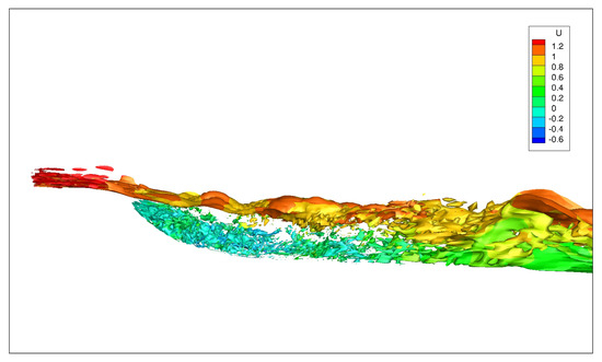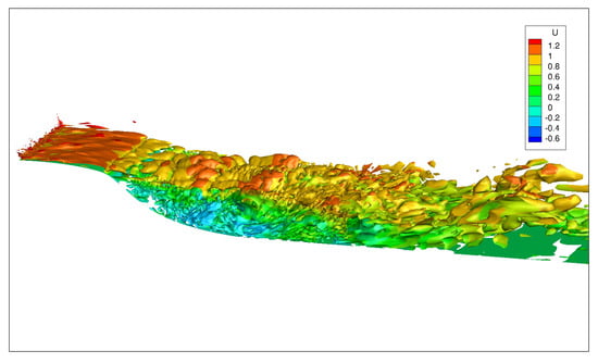 Figure 7 shows the unsteady velocity flow field due to the turbulence. The blue region in the contour plot indicates the negative u-velocity, hence indicating the reversing flow region. The Q-criterion was the second variant of the velocity gradient tensor demonstrating the relative dominance of the rotational component of the velocity gradient over the stretching component in the deformation of a fluid element. The iso-surface of Q-criterion on the hump surface depicted the flow separation in the three-dimensional configuration shown in Figure 8. An instantaneous iso-surface of Q = 150 colored by the streamwise velocity magnitude exhibited the complex nature of flow separation at the aft portion of the hump. The vorticity magnitude of the flow over the hump is presented in Figure 9. It is noticeable from both figures that the turbulent length scales were larger downstream of the separation region.