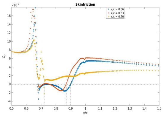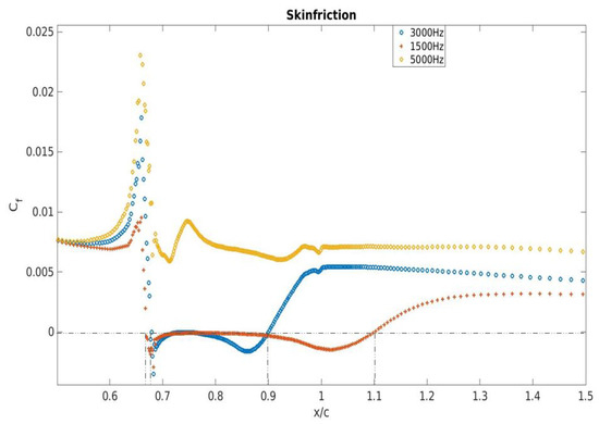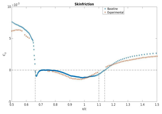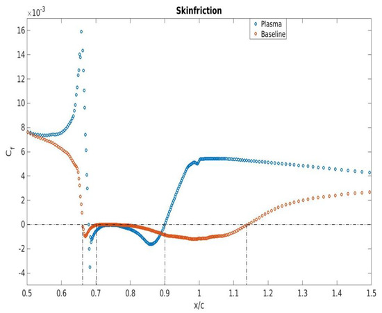 The skin friction coefficient gave a precise location of the flow separation and flow reattachment. At the time of flow separation, the value decreased to zero, and it rose to zero when the flow reattached. Figure 15 shows the skin friction coefficient in the plasma actuator case and compares the result to the baseline case. The blue line represents the plasma actuator case, and the red line represents the baseline case. A change in the skin friction coefficient is shown in the figure. There was a small delay in separation at the leeside of the hump. The separation started at location . The biggest difference was found where the flow reattached. Flow reattachment occurred at location . The overall separation region for the plasma enabled flow was from to , and the separation region was between location and for the baseline case. Thus, the overall flow separation was reduced by a reasonable margin. The horizontal dotted line is placed at equal to zero to determine the streamwise locations of separation and reattachment.