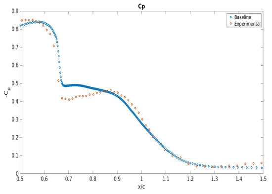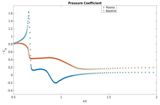 Figure 16 represents the change in pressure coefficient, , due to plasma actuator effects, and it compares the plasma result to the baseline result. The pressure dropped by a significant margin at the position where the separation started, i.e., . The sudden decrease in indicated that the induced plasma body force increased the overall flow velocity compared to the baseline case. This flow remained separated and then reattached downstream of the trailing edge. The plasma force accelerated the fluid near the plasma affected area, which caused a local pressure drop. A significant increase in was observed at the same location, where a decrease in was seen for the baseline case. This was due to the pressure increasing suddenly at the separation point and caused the fluid flow near the wall to retard.