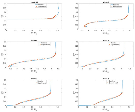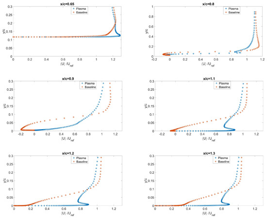 Figure 17 helps us to understand the effects of the plasma actuator on the flowfield. For the baseline case, at the locations inside the flow separation, i.e., , , and , the flow pattern in the boundary followed in the reverse direction for the separation and recirculation, which is also described in Figure 12. As the plasma actuator was located at the location where the separation began, the actuator assisted the flow to remain attached. Location was still under the separation region, whereas location was free from separation. Figure 17 also holds up the same conclusion with the skin friction coefficient results in Figure 15 regarding the flow reattachment at . The further the location was from the flow reattachment, due to sudden flow acceleration, the velocity increased rapidly at the boundary, but slowed down due to relative low momentum flow at the top. This caused the velocity to rise to reach the freestream condition.