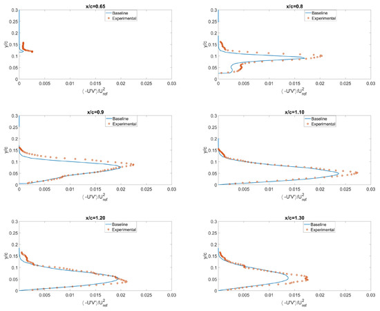 Normalized mean Reynolds stress along y/c at different streamwise locations.
