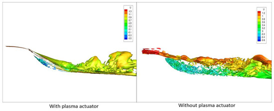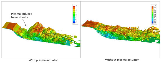 Figure 18 and Figure 19 show the effect of the plasma induced force by comparing the Q-criterion and the vorticity magnitude, respectively. The positive value of the Q-criterion was the proof of the dominance of rotational components over the strain or stretching components. A push in the flow downstream is visible in Figure 18, and it visually demonstrates the effects of the plasma enabled body force. The blue contours in Figure 19 indicate the reversed flow. It is seen that, for the plasma case, flow reversal, and hence the separation, was significantly smaller than the separation in the baseline case.
