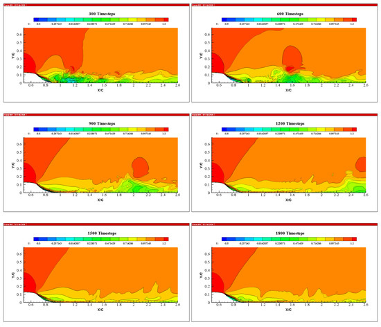 Figure 20 illustrates the plasma force effects on the instantaneous u-velocity over a certain period of time. After 300 time steps or 0.6 non-dimensional times, the initial accelerated momentum increased the velocity and reduced the flow instability near the wall, shown in the top left of Figure 20. The rest of the snapshots in the figure show the effects at later time steps. Flow separation and instabilities at the wall were pushed downstream with increasing time.
