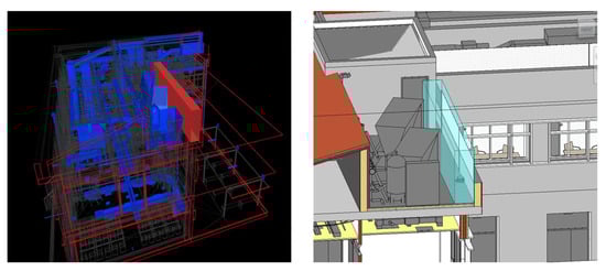 Likewise, some conflicts were avoided at the design stage due to the coordination of the different disciplines such as Architecture and MEP. Specifically, Figure 6 shows sunshades intersection of modern building with rainwater downpipes ( ID_02). This type of intersection conflicts can only be identified when real-sized data crossing occurs in BIM environments. On the contrary, in the 2D models pre-dimensioned it is hard to detect the early identification of these problems. Again, this conflict was identified before the beginning of works at the design phase, 81 weeks ahead the construction date, this implies a long time to find appropriate solutions without site improvisations. I f the project had not been developed under BIM methodologies, it would have caused a conflict on site during the metal structural work at week 29. It would have paralyzed the project, and would have led to modifications in the original project, with the subsequent reworks. In addition, the project would have been delayed due to slowness of changes, since it would not have been a parametric drawing, the automation in the modification of drawings and views would not have been possible, and therefore, the costs of the project would have been increased and there could have been errors and inconsistencies between the project drawings. The quantification of economic deviations was estimated in 7425.60 euros and two weeks of delay.