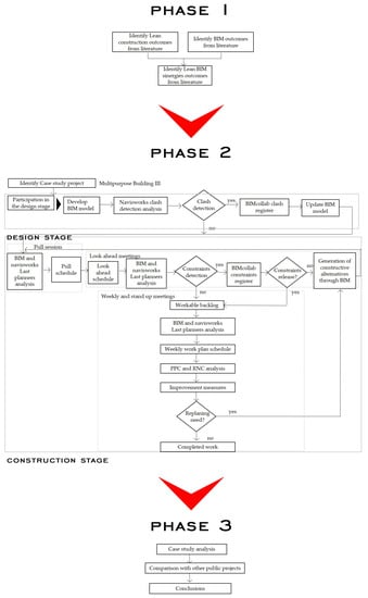 Although much research has been done on the application of BIM and Lean paradigms individually, there is a lack of research on the synergy of both paradigms. This is aggravated if we narrow the search to a more practical approach that moves away from theoretical research. The literature review has made us aware that there is hardly any previous practical research that combines both paradigms. Therefore, the aim of this research is to provide knowledge and evidences in a empirical way to this area so little explored, or this, t he study adopted on a constructive research approach with qualitative methodology defined and validated through a case study. Case study is presented in some works as the most appropriate research method for presenting the information in the context of a particular project, inclusive of the project’s characteristics and give actual project data, making possible generalisation from case-studies. It is described as a useful method to identify potential benefits of the system, especially those that are intangible, to determine its importance, as well as provide the best correlation with real-life situations. Several studies have already adopted a case study approach, such as in Reference [56], where a case study approach was adopted to explain the dynamic quality control model that was developed from a comprehensive review of the literature and site investigation. Similarly, in Reference [57], BIM benefits and the impacts on project efficiency were analysed via case studies within a large industrial setting where similar projects were evaluated, some implementing BIM and some with traditional, non-BIM approaches. Also, in Reference [58], due to the lack of case studies identified in the literature review, and to provide empirical evidence of the value and challenges of BIM, a case study of Northumbria University’s city campus, was used to empirically explore the value and challenges of BIM in facility management. Also, in Reference [59] a case study of BIM deployment in a hospital construction project was developed to serve as an example of BIM implementation and collaborative work in construction projects, in order to provide findings about key factors influential to enable digital collaboration.
