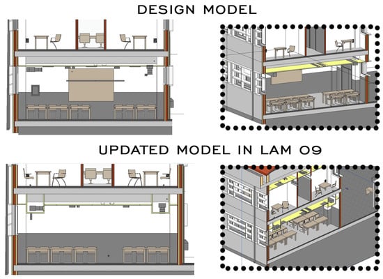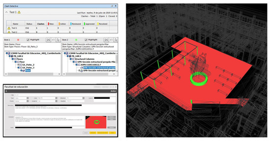 Furthermore, other conflicts were avoided at the construction stage using the BIM model as a prototype. The visualization of the slope options in the underneath slab of the yard and the level of access in the classrooms of the north façade (ID_10) is a good case in point, where it was assessed which elements were geometrically affected. As shown in Figure 9, through the use of the navisworks management tool it is shown that elements entered into conflict when modifying the ground, the elements external to the conflict were turned off and the elements that intersected were highlighted in red and green. In this way, during the meeting it was possible to assess the possible consequences, allowing all the agents involved to contribute their vision. The BIM prototype allowed the whole team to visualize different solutions during the Look Ahead meeting held in week 27 for activities performed in the week 31. Therefore, through the LAM 31 and the BIM visualization the stakeholders anticipated one month the identification of the matter. Rapid generation and evaluation of construction alternatives was possible through the visualization of the form. This fact not only allowed them to make better decisions without improvisation but also to count on the commitment and collaboration of those who carried out the activity. With this anticipation, future flooding in the classroom were avoided, and a correct execution was carried out. Savings of this constraint were quantified in 2 weeks and 23,205€. The visualization and simulation during the construction process allowed stakeholders, including workers in charge of slope formations, to achieve better project performance, increasing productivity and quality through the Last Planner sessions.
