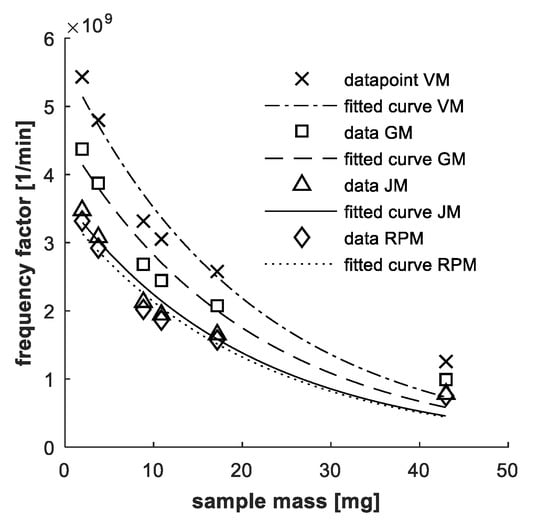 To gain an understanding of the effect of varying masses in the TGA as explained in Section 2.2, the experiments listed in Table 4 were evaluated using the Arrhenius equation together with all four kinetic models (VM, GM, RPM, and JM). In Figure 1, the frequency factor is plotted over the sample mass for each conversion model. A correction term of an exponential type fits the results for every conversion model to a satisfactory degree (), with as the model parameter.