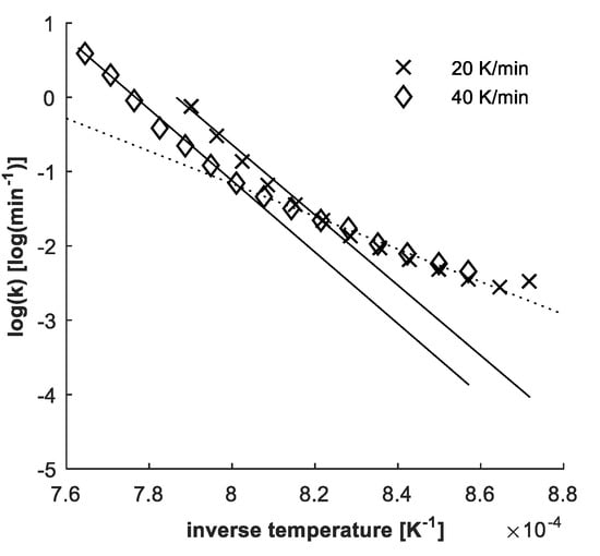 The test configuration No. 1 of the CO2 gasification was repeated with heating rates of 20 K/min and 40 K/min in another oven of the TGA. In Figure 3, one representative run for each heating rate is plotted. The solid lines represent the reaction rate according to the Arrhenius model for both runs. The dashed lines show the reaction rate according to the Arrhenius model, when only inverse temperatures of more than 8.2 × 10−4 K−1 are considered. It is apparent that the change in reaction rate happens at different temperatures.