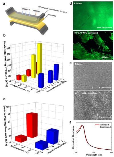 In conclusion, we demonstrated tightly compacted perovskite laminates on flexible substrates via hot-pressing. The optimal perovskite laminates were achieved at 90 °C and 10 MPa; these could sustain a horizontal pulling pressure of 636 kPa and a vertical pulling pressure of 71 kPa. The perovskite laminates exhibited increased crystallinity and a change in crystallization orientation, which was affected by temperature and pressure synergistically. The absorption edge and PL emission peak of the perovskite laminates were identical to those of the pristine perovskites, and the PLQY value also survived the negative impact of thermal degradation. This work demonstrates a promising approach to physically laminating perovskite films, which may accelerate the development of roll-to-roll printed perovskite devices and perovskite tandem architectures in the future.