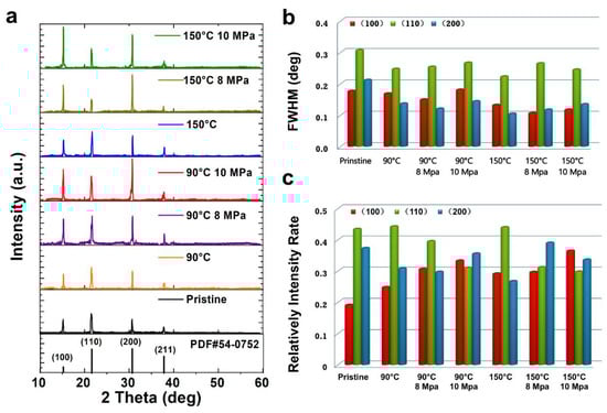 To judge the recrystallization and crystallization orientation change of the perovskite laminates, we compared the relative intensity of each peak in the same sample, as shown in Figure 2c. The relative intensity was taken as the ratio of the intensity of one peak to the total intensities of the three main peaks at 15.2°, 21.5°, and 30.7°. The relative intensities of the dominant diffraction peaks corresponding to the (100), (110), and (200) lattice planes also varied significantly, proving recrystallization of the laminated perovskites [20,33]. It was found that the relative intensities of the (100) and (200) diffraction planes increased monotonically with increasing imposed pressure, while the intensity of the (110) plane decreased after lamination. The lamination induces a change in crystallinity from a (110)-dominant scenario to a (100)- and (200)-dominant scenario. When compared with the heated samples without applying pressure, the pressure-induced recrystallization was much more significant and preferred crystallization orientation along the (100) and (200) planes. It was reported that the (100) peaks in perovskites have a high relationship with heavy atoms Pb and Br with long-range ordered packing [16] and are able to provide efficient charge transport [34,35].
