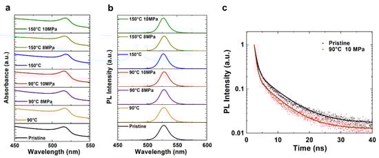 (a) Absorption and (b) photoluminescence (PL) spectra of the pristine CsPbBr3 film and the laminates prepared under different conditions. (c) Time-resolved photoluminescence of the pristine CsPbBr3 thin film and the laminates prepared at 90 °C and 10 MPa.