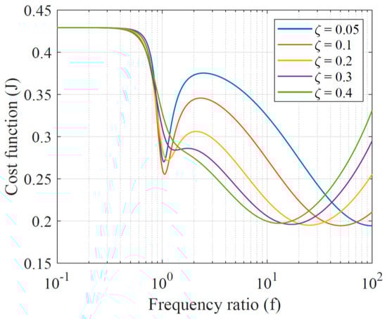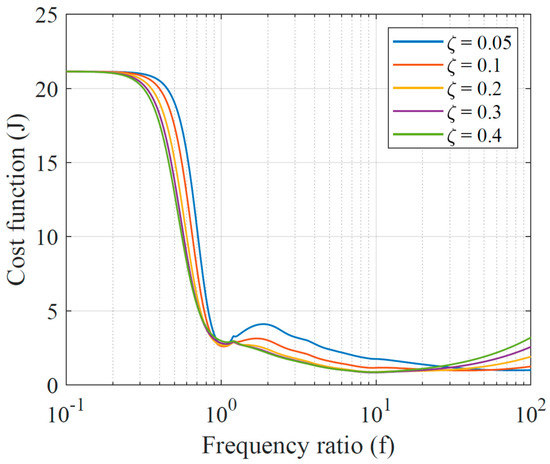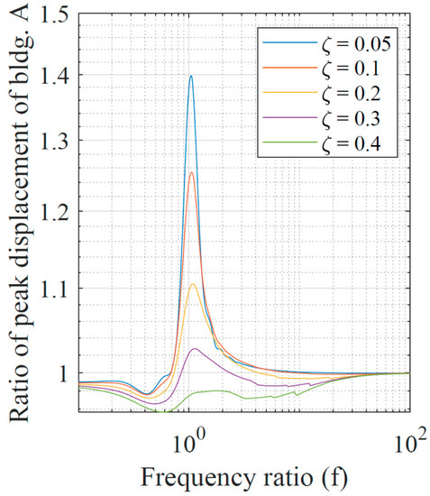 An example of the optimization problem is presented here. The properties of buildings A and B are fixed for numerical simulations. Their frequencies are taken as 6.04 and 7.58 rad/s, and the damping ratio is 5% for both. The frequencies are the same as those of the two buildings studied by Abdullah et al. [28]. The mass of the two buildings are equal, and the mass of the TMD is expressed as a fraction of the mass of building A, i.e., . The frequency of the TMD is denoted by , and the frequency ratio is defined as . The damping ratio of the TMD, expressed in terms of the mass and frequency of the TMD, is denoted by . The variables of interest are therefore and .
