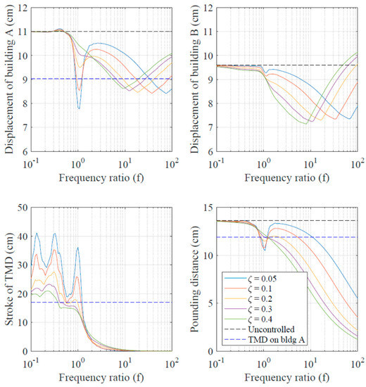 The results are shown in Figure 3. The maximum displacement of the two buildings are shown on the top panel. The maximum stroke of the TMD is shown in the bottom left panel. Here, stroke is defined as the relative displacement of the TMD mass from building A. Pounding distance is shown in the bottom right panel. For comparison, the response of uncontrolled buildings is shown with black dashed lines. Another scenario considered is where an optimally tuned (based on Sadek, [30]) TMD is placed on building A whereas building B is uncontrolled. In this case, the frequency tuning ratio is 0.96 and the damping ratio is 0.22. The results corresponding to this are shown with dashed blue lines. The results show that the local minima, similar to those observed in Figure 2, occurs in the displacement response of building A when the TMD is tuned to the frequency of the building. However, the combination of and that minimizes does not necessarily minimize the displacement of building A. For example, for approximately equal to 1, a damping ratio of 10% is required to minimize , whereas 5% damping ratio minimizes the peak displacement of building A. This can be explained by the larger stroke of the device when the damping ratio is low, as is clearly seen in the bottom right panel of Figure 3. The optimal solution near is not effective in controlling the peak response of building B.