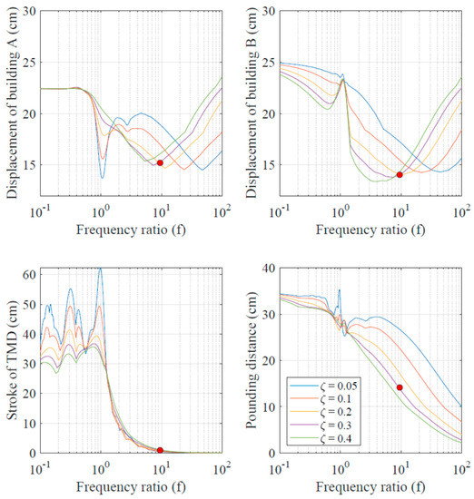 Variation of the peak displacements of buildings A and B with frequency ratio and damping ratio is shown in Figure 6. The solution considered optimal by Abdullah et al. [28] is indicated in the figure with red dots. The response of building A, to which the STMD mass is connected by a spring, is optimally controlled when the frequency ratio is close to 1, and the damping ratio is low. This solution, however, is not effective in controlling the response of building B. The optimal solution, based on the global minima of , as denoted by red dots, is effective in controlling pounding as well as reducing the response of both the buildings. However, the solution uses a very stiff spring, and the TMD mass does not move relative to building A.