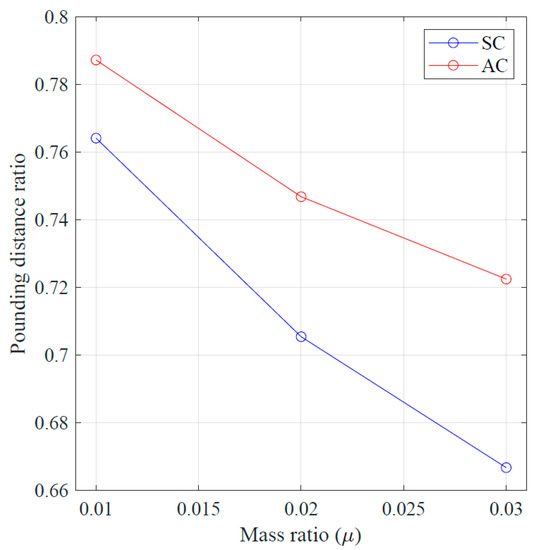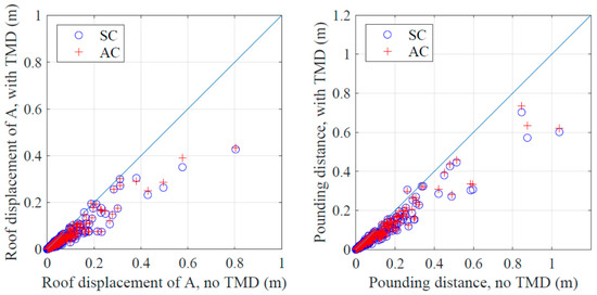 Ratio of pounding distance of the two buildings with controlled with STMD (SC) and building A controlled (AC) schemes to that of uncontrolled buildings.