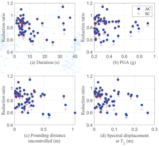 To illustrate the effectiveness of AC and SC schemes in reducing the minimum separation distance between the two buildings, reduction ratio, which is defined as minimum separation distance of the controlled building divided by that of the uncontrolled building is shown in Figure 8. The smaller this ratio, the more effective is the control scheme. Effectiveness is investigated against different ground motion and structural response parameters. Only those ground motions with PGA larger than 0.2 g are used in the figure. Here, g represents acceleration due to gravity. Ground motions weaker than this are not considered as they were found to cause a low risk of pounding. Figure 8c shows two different clusters of data, one below ~25 s, and the other to its right. The cluster to the right has very few data points, and any apparent trend in this cluster is not reliable. When duration is less than 25 s, the Pearson correlation coefficient between reduction ratio and duration is −0.44 with a p-value of 0.0011, which shows that the correlation is statistically significant, and not by random chance. Figure 8b shows that the effectiveness of the TMDs is independent of PGA. There seems to be a weak negative correlation between the pounding distance of the uncontrolled structure and the effectiveness of TMD schemes. The Pearson correlation coefficient was found to be −0.17 with a large p-value of 0.21, which means that any apparent trend in the data is statistically insignificant. The same observation can be made in Figure 8d, which shows that the effectiveness of TMD schemes is independent of spectral displacement at the fundamental period of the uncontrolled structure. In all these cases, there is no significant difference between the SC and AC schemes, which means that sharing the TMD does not seem to provide additional benefit in preventing pounding.