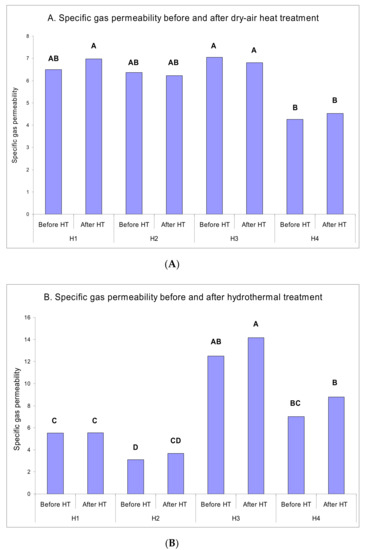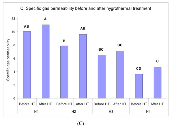 Specific gas permeability values in the un-impregnated specimens heat-treated in hot-air (A), hydrothermal (B), and hygrothermal (C) mediums (× 10−13 m3.m−1) (Gas 5) (HT = heat-treated; Hnumber = heated at the number of hours) (Letters on each column represents the Duncan groupings).