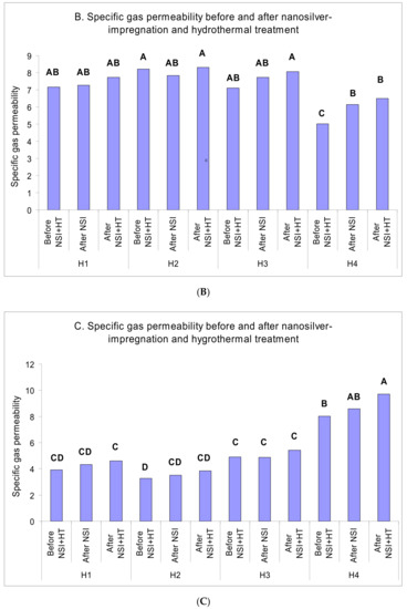 Specific gas permeability values in the nanosilver-impregnated specimens heat-treated in hot-air (A), hydrothermal (B), and hygrothermal (C) mediums (× 10−13 m3.m−1) (Gas 5) (HT = heat-treated; NSI = nano-silver impregnated; Hnumberv = heated at the number of hours) (Letters on each column represents the Duncan groupings).