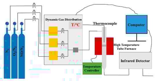 According to published literature [13,14,15,16,17] and previous experimental data [20,21], the optimal temperature of C-NO reduction is about 800–900 °C, so the temperatures selected in this experiment were 800 °C, 850 °C, and 900 °C. The O2 concentration was too low to be easily realized in an industrial atmospheric system. A higher O2 concentration produces a large amount of carbon oxides, which may affect the reduction ability of C-NO [20,21]. Therefore, we selected O2 concentrations of 0.5%, 1%, and 2%.