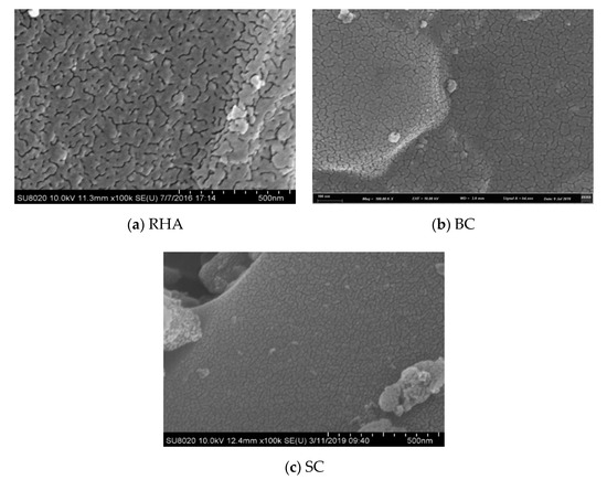 SEM images of (a) RHA, (b) BC, (c) SC. The magnification for all samples is 100 k.
