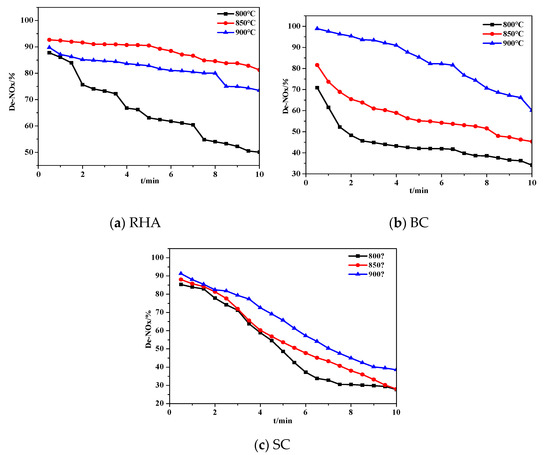 Figure 3 shows the denitration rate of the three biochars at different reaction temperatures. From Figure 3a, at 800 °C, 850 °C, and 900 °C, the initial denitration rates of RHA were 87.7%, 92.7%, and 89.7%, respectively. The denitration rates of RHA were higher at the start of the experiment in the three temperature conditions, which indicates that RHA has high reduction ability at high temperatures. As shown in Figure 3a, the denitration rate of RHA was the highest at the temperature of 850 °C and decreased slowly with time. When the temperature increased to 900 °C, the denitration rate of RHA decreased. The reason for this may be that at 850 °C, the reduction of NO by C reached an optimal state. At high temperatures, carbon oxides are more likely to be produced [22]. When the temperature was 900 °C, more carbon oxides were generated. On the one hand, the carbon oxides produced consumed C and O, and on the other hand, it suppressed the reduction reaction. Figure 3b shows the denitration rate of BC at different temperatures. The initial denitration rates of BC were 70.9%, 81.6%, and 98.9%, corresponding to the environmental temperatures of 800 °C, 850 °C, and 900 °C, respectively. The differences in the initial denitration rates at the three reaction temperatures were larger compared to those of RHA, and the highest denitration rate was measured at 900 °C. From the data, it can be seen that BC is a good reduced of NO when the temperature is above 850 °C. This may be due to the fact that BC contains more C-O bonds and (NCO)x bonds than RHA, which are promote the reduction reaction. These chemical bonds are more active at high temperatures, so the denitration rate was the highest at 900 °C. Figure 3c shows the denitration rate of SC. The initial denitration rates at 800 °C, 850 °C, and 900 °C were 85.3%, 88.0%, and 91.3%, respectively. The differences in the denitration rates of SC at different temperatures were small. SC displayed a higher reducing effect on nitrogen oxides at higher temperatures. In summary, the optimum reaction temperatures for RHA, BC, and SC were 850 °C, 900 °C and 900 °C, respectively.