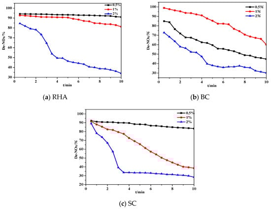 Based on the above conclusions, RHA, BC, and SC were selected to investigate the effect of 0.5%–2% O2 on the denitration rate at the reaction temperatures of 850 °C, 900 °C, and 900 °C, as shown in Figure 4. The initial denitration rates of RHA were 94.2% at 0.5% of O2 concentration, 92.7% at 1%, and 84.5% at 2%. As shown in Figure 4a, when O2 concentration was 0.5% and 1%, the denitration rate decreased slowly with time. However, the initial denitration rate was lower when the oxygen concentration was 2%, and its decline was faster, so that a 36% denitration rate was reached after 10 min. As shown in Figure 4b, the denitration rate of BC increased first and then decreased with the increase of O2 concentration. The initial denitration rates of BC were 84.9% at 0.5%, 98.9% at 1%, and 72.7% at 2% of O2 concentration, respectively. When the oxygen concentration was low, nitrogen oxides were adsorbed on the surface of BC, occupying some reaction sites and resulting in a weaker C-NO reaction. When the oxygen concentration was high, more reaction sites caused C-NO to react more easily. The initial denitration rate was lower at 2% oxygen concentration. As shown in Figure 5b, as the oxygen concentration increased, the relative content of CO2 increased. At 2% oxygen concentration, the reaction produced more CO2, which suppressed the reduction reaction and decreased CO production. As shown in Figure 4c, the initial denitration rates were almost the same t different oxygen concentrations. The denitration rate declined faster with time under higher O2 concentrations.