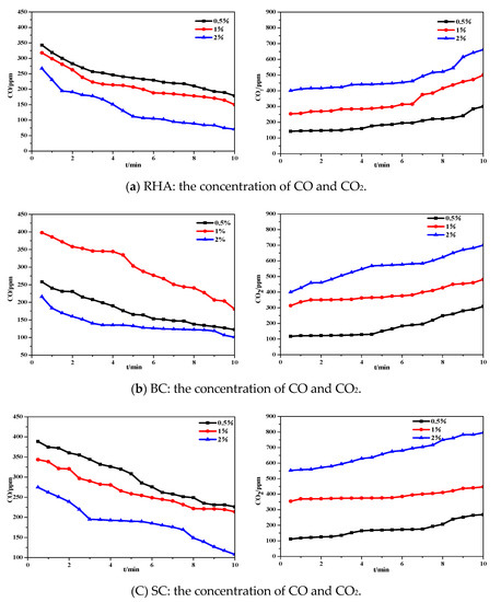 The concentration of CO and CO2 produced during the C-NO reduction reaction of the three kinds of biochar is shown in Figure 5. As shown in Figure 5a, with the increase of O2 concentration and reaction time, the relative content of CO produced in the reduction of nitrogen oxides by RHA decreased. The concentration of CO2 increased with increasing O2 concentration and reaction time. The relative changes in the concentration of CO and CO2 indicated that CO participated in the reduction reaction to generate CO2. Figure 5b shows the concentration of COx produced by the reduction of NO by BC. The concentration of CO was the highest when O2 was 1%, decreased in the presence of 0.5% O2, and further diminished with 2% O2. Under high temperature conditions, carbon is more likely to generate CO as the oxygen concentration decreases. However, as the oxygen concentration increases, CO2 is more easily generated [22]. Thus, at the optimal oxygen concentration, there is more CO and less CO2. The concentration of CO2 increased with the increase of O2 concentration and reaction time. As shown in Figure 5c, the COx concentration trend in the presence of SC was similar to that obtained with RHA. From the analysis of the COx concentration generated from the three biochars in the reduction of NO, some conclusions can be drawn. CO participates in the reduction reaction, and its involvement is related to O2 concentration during the conditions. With the increase of O2 concentration, a large amount of CO2 will be generated and will inhibit the activity of the reaction sites on the carbon surface, thus suppressing the reduction of C-NO.