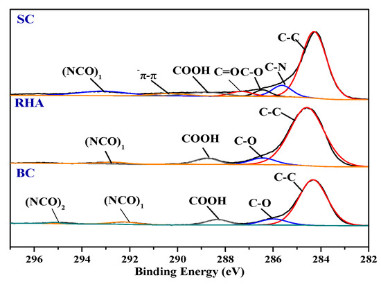 According to the above experimental data, the optimum denitration rates of RHA, BC, and SC were 850 °C, 900 °C, and 900 °C, respectively. Under the protection of N2, the three materials were held at their optimum denitration temperature for 10 min, and then we tested the type and relative content of chemical bonds on the surface of their samples by XPS. XPS allowed the quantitative analysis at the micrometer-scale of the surface C1s of the samples, which contained both organic and inorganic C element; in contrast, EA tested the organic C element of the whole sample. Therefore, the rests of the two analyses were very different, as shown in Table 3 and Table 4. The chemical bond species of the surface C1s of the three materials as well as their relative contents are shown in Figure 6 and Table 4. The relative content was obtained by dividing the area of each single peak area by the total peak area.