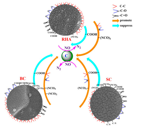 From the above studies, it can be found that the C-O bond is a reactive bond, and NFGs improve NO reduction. However, researches published so far mainly focused on a material, such as activated carbon or bamboo charcoal, and no systematic comparison of various biochar materials including their composition and structure has been conducted.