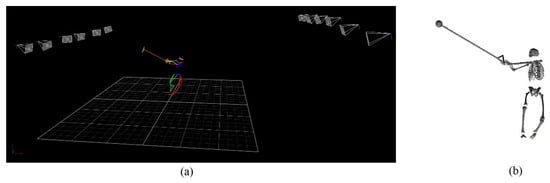 (a) The set-up of the cameras and a sample frame of the 3D motion capture of the hammer throw; (b) The full-body biomechanical model of the hammer throw.