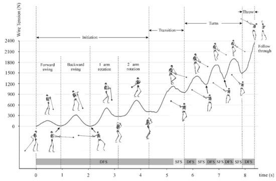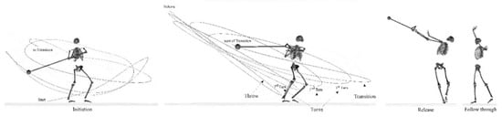 Currently, there are a number of classification schemes used to describe the phases of a hammer throw, some focused on turning control [,,] and others emphasized on the instances during hammer throw, e.g., (1) start of entry, (2) single support phase, (3) double support phase, and (4) release []. These studies provide some perspectives of motor control on the hammer throw, and their collective shortcoming is that they fail to reveal the holistic control process. One especially important perspective—the relationship between force generation (kinetics) and the full-body control (kinematics) during throwing—is unclearly addressed in existing research, and as such, an understanding of the motor control remains incomplete for the hammer throw.