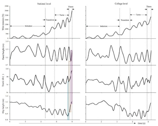 Thirdly, our data establishes a practical way that could easily identify the effectiveness of a throw. The hammer throw is a full-body movement, requiring multi-joint coordination. Three-dimensional motion capture is currently the reliable method for demystifying the control patterns of multi-joint coordination in human full-body movement [,,]. However, practitioners find that the 3D motion capture technology is too cumbersome to be useful in practice [,]. Through our synchronized data analysis, we have found that hand and hip vertical height as well as the trunk tilt could be used to reveal the multi-joint coordination. When considering the effectiveness of the full-body coordination in generating explosive force, it is important to note that the whip-like control mechanism should be followed [,], i.e., the generation of the explosive-force should first start in strong/big muscle groups and follow the big-to-small-muscle sequence flow. In case of throwing the hammer (i.e., the throw phase), a performer should firstly extend the legs, then the trunk (i.e., trunk extension), and lastly perform the shoulders/arms throw for the release of the implement. Due to the force required, the explosive control (as fast as possible) and the multi-joint coordination, such a whip-like performance in a hammer throw needs, obviously, years of strength and coordination training in order to improve its effectiveness. Figure 4 and Figure 5 show that the elite athlete had formed the whip-like control, i.e., leg extension first (highlighted by a blue rectangle in Figure 4), followed by trunk extension with further leg extension (highlighted by an orange rectangle in Figure 4), and explosive arm up-swing with the final leg and trunk extension (highlighted by a violet rectangle in Figure 4). Such a whip-like throw was not found in the performance of the college-level athlete. The short plateau in the leg extension and up-and-downs in the trunk extension (Figure 4) as well as not-fully-extended leg and trunk may suggest a weak leg and trunk and/or poor leg-trunk coordination of the college-level athlete. Additionally, SSC (stretch-shortening cycle) is the other mechanism, influencing the generation of muscle tension/force []. A properly dynamic pre-lengthening of the muscle groups involved would improve the effectiveness of the throw-power generation. Our data (Figure 4) indicates that the elite subject could apply the SSC principle in all the turns and the throw in a more efficient way than the college-level subject.