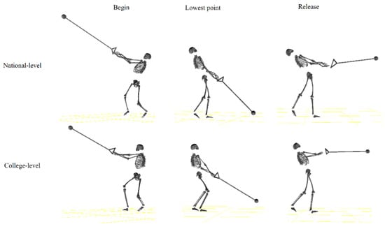 A simultaneous application of force/tension measurement and biomechanical modeling permit quantification of both kinetics and kinematics of human motor skills [,,]. It is the only accurate way that can be used to make the connection between the throw-force generation and the motor control during a throw. As such, our approach provides the means to correlate the kinetic characteristics to kinematic ones. Furthermore, data comparison of different-level athletes is often applied in revealing relevant factors in motor learning [,,]. Therefore, by comparing and abstracting the alterations between elite and advanced athletes, our study would be able to select key parameters, simplify the skill analysis, and establish a way of developing a new biofeedback tool on the motor-control optimization of the hammer throw.
