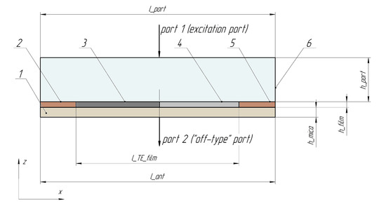Antenna cross-section in z-x plane; = 1000 m—the length of the wave excitation port; = 800 m–the length of thermoelectric couple containing two films, = —the full antenna length; = 150 nm—the thickness of the films; = 40 m—the thickness of mica substrate; —the distance between wave excitation and antenna, the value of was changing within the simulations.