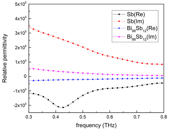 The real and imaginary parts of a relative permittivity of thin-film Sb and BiSb on mica substrate in the frequency range of 0.3–0.8 THz.