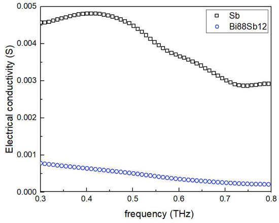 Electrical conductivity of antimony and bismuth antimonide 150-nm thin films on mica substrate in the frequency range of 0.3–0.8 THz.
